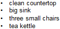 6. A writer is developing a short story in which he would like to convey a vivid impression of the kitchen where part of the story is set. Which of the following groups of descriptive details about the kitchen would be most effective for the writer to use in the story?