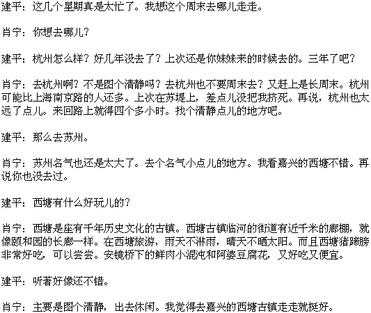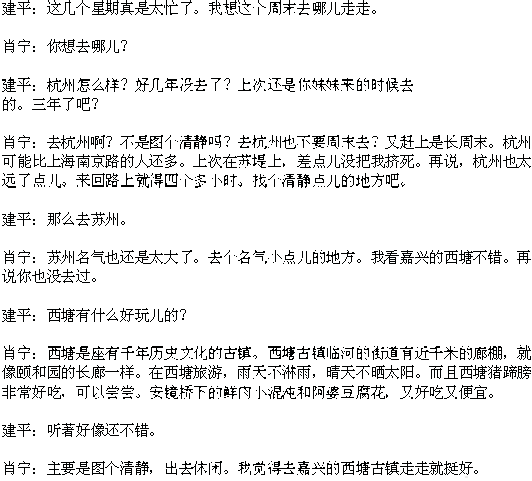 - Correct Response: C. In this dialogue, the two individuals are discussing where to go for the weekend. The main focus of the discussion is on why the city of Xitang is a good location to visit due to its nice weather, good food, and interesting history.