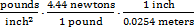 3. A technician knows that the pressure inside a hydraulic hose is 300 pounds per square inch. If 1 pound = 4.44 newtons and 1 inch = 0.0254 meters, which of the following expressions equals the pressure inside the hose in pascals?